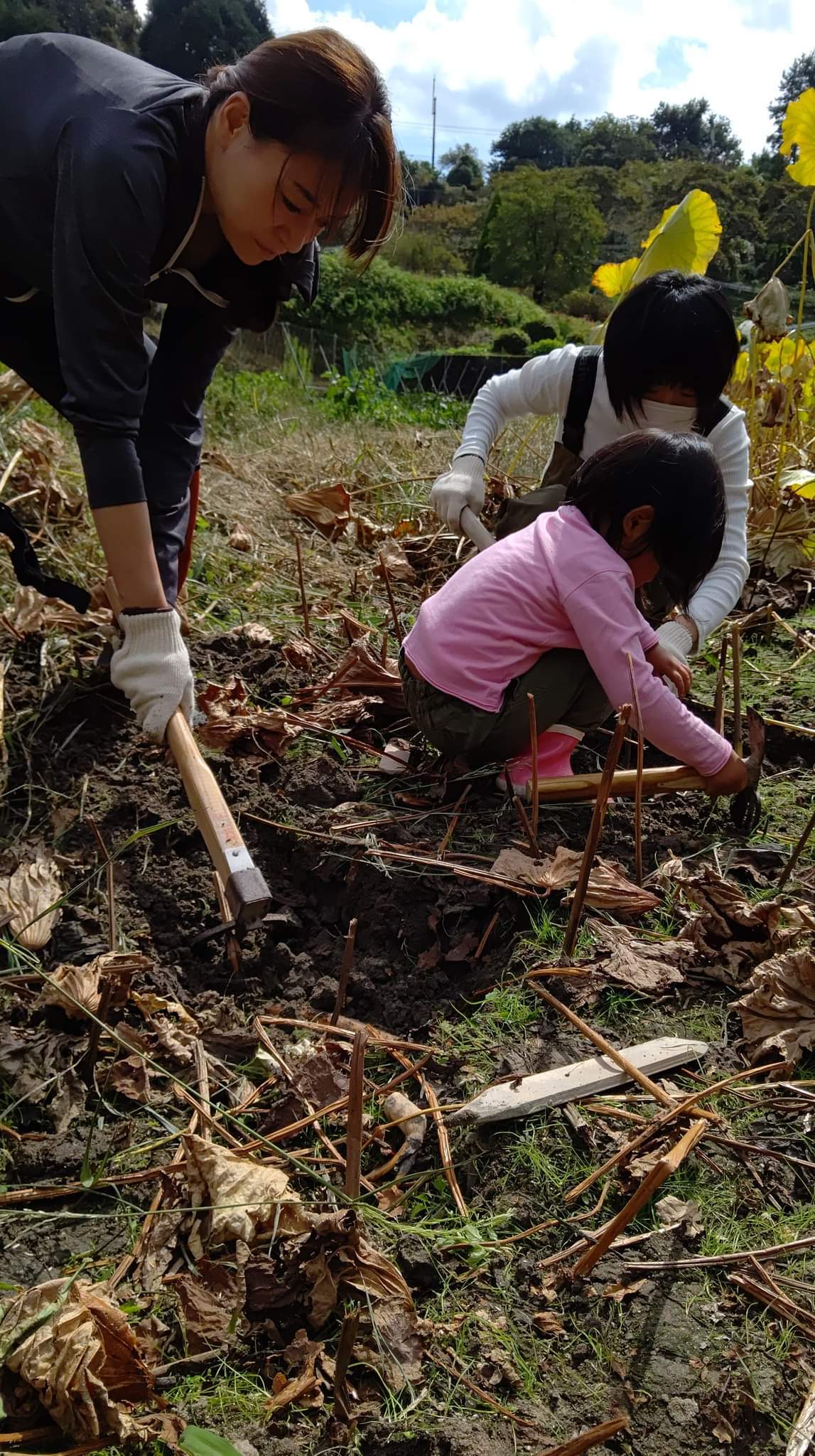 水を抜いた抜いた畑で、まずは蓮根を鍬を使って1本1本丁寧に掘り起こします。まるで遺跡発掘をするかのように、子供たちの目はキラキラと輝き、慎重に掘ることによって得られる達成感は他に代えがたい体験です! 水を抜いた畑なので、小さなお子様でも安心して蓮根掘りが出来ます。